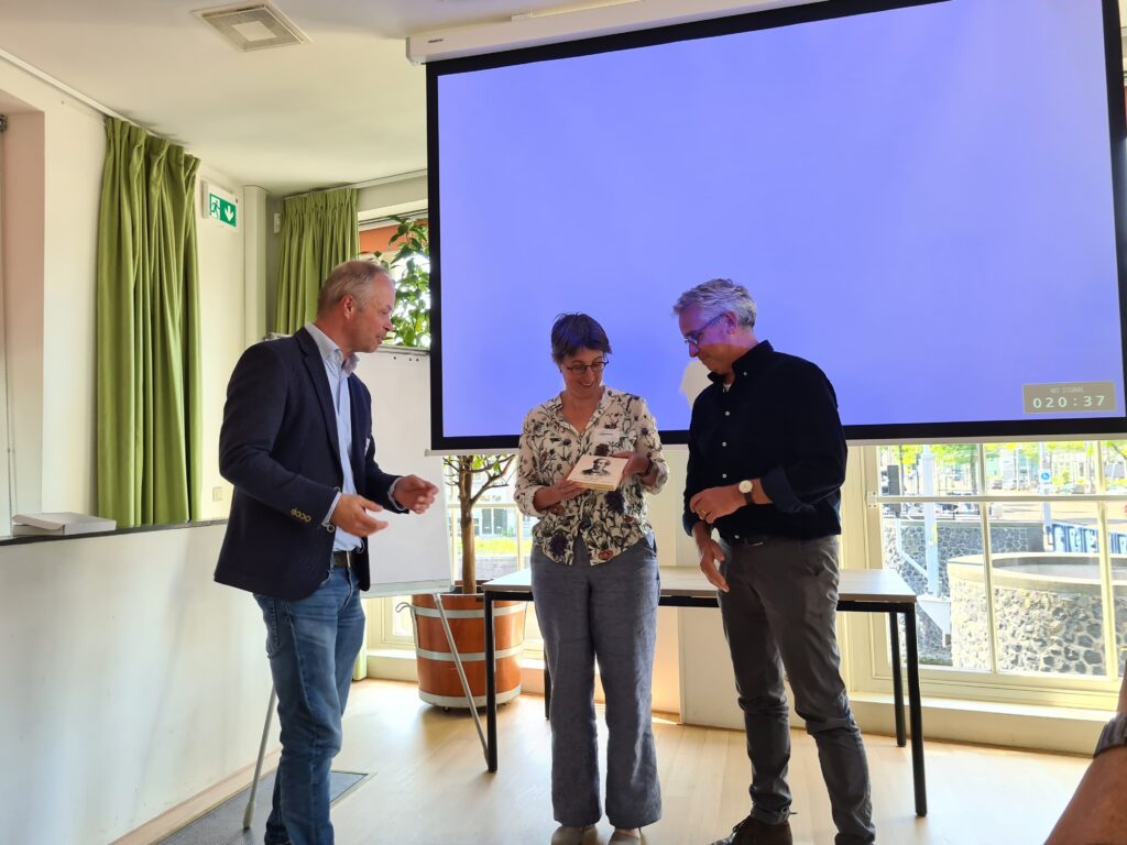 Uitreiking van de prijs door juryvoorzitter Martijn Bezemer (links) aan promotoren Liesje Mommer (WUR) en Jos Raaijmakers (NIOO) tijdens het symposium “150 jaar Hugo de Vries” op 8 juni in de Hortus Amsterdam.